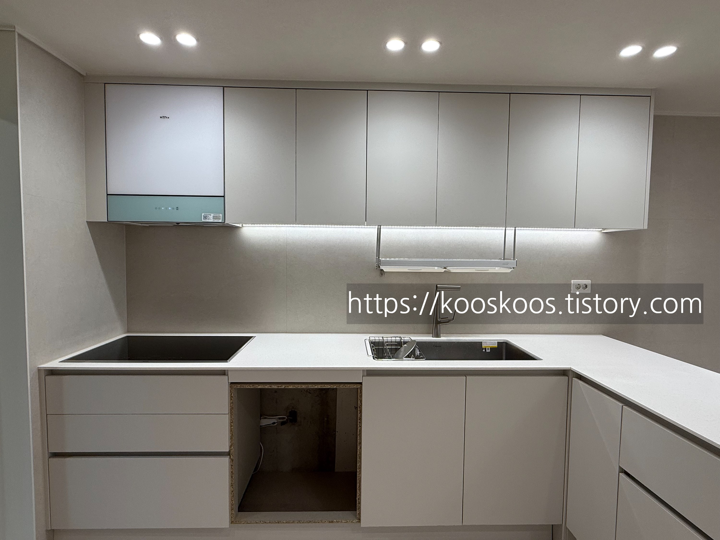 긴 홈바에는 전자레인지와 커피 머신 그리고 탁상 달력 등 여러가지 물건들이 놓여져 있는데,, 정리를 잘 하지 못하면,, 그렇죠,,, 정신 없어집니다.. 그러면 모두 아래 서랍으로 들어가는거죠 ㅋㅋㅋㅋㅋ 주방 후드는 "하츠 부띠크 로망스 후드 BRC-60G 민트" 입니다. 그레이는 언제까지 품절인건지,,,, 한참을 기다리다 결국 민트로 구매했는데, 전체적으로 밝은 회색 톤이어서 그런지 민트도 나쁘지 않습니다. (그래도 그레이였음 어땠을까라는 생각이..... :)
