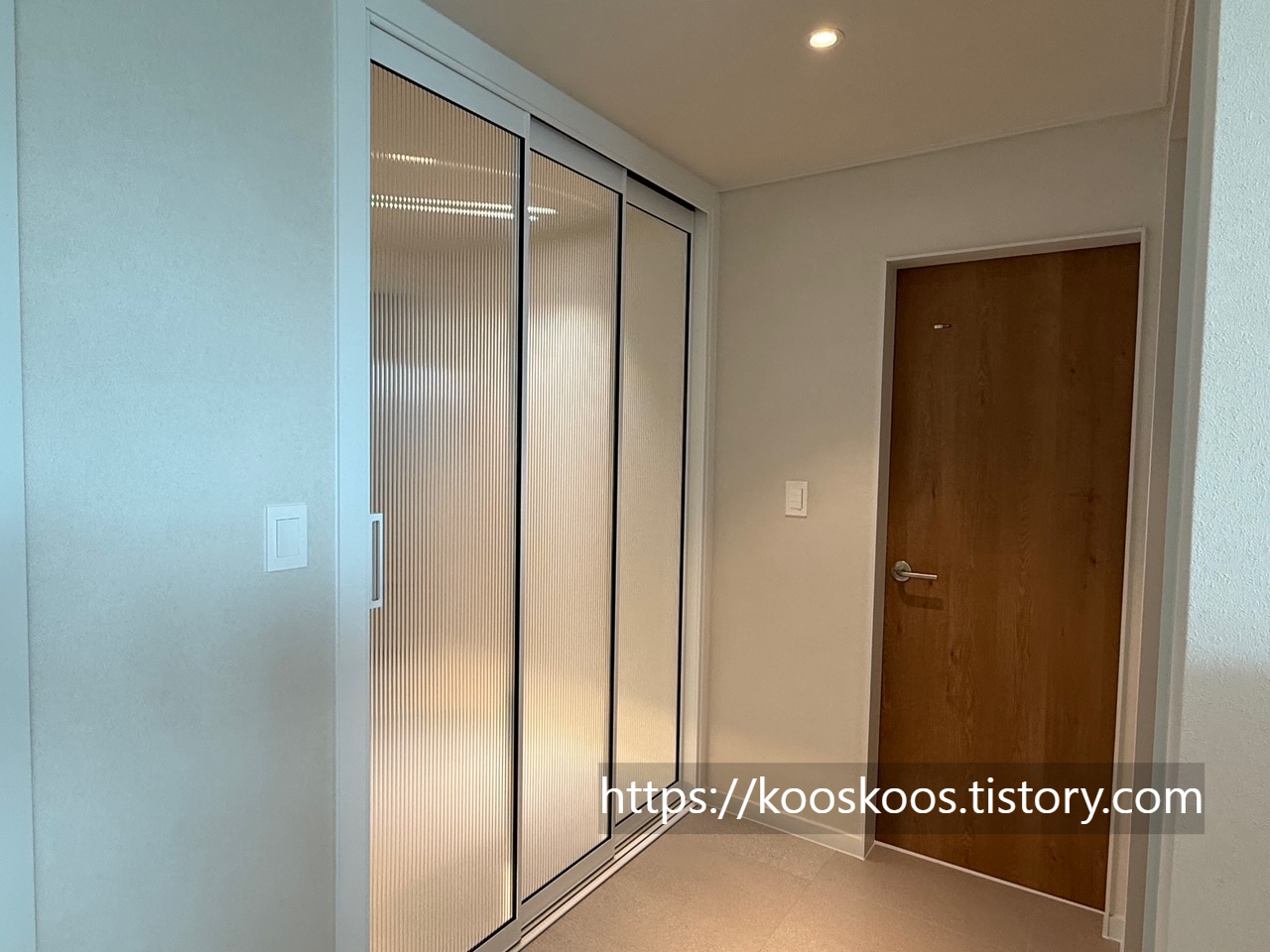 완성된 3연동 불투명 모루 유리의 중문을 보니 너무 이쁜 것 같습니다. (비싼 아치형 중문 등 여러가지 옵션이 있었지만,,, 가격대가 갑자기 상승하는 바람에 저희는 기본인 3연동 중문으로 선택하였습니다.)